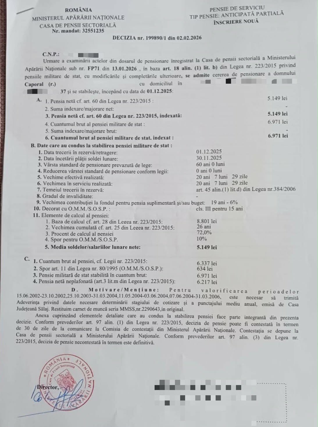 Imaginea care a stârnit această furie justificatoare este emblematică. Am intrat în posesia unei decizii de pensionare care, deși perfect legală în litera ei, urlă inechitate prin spiritul său. Conform documentului nr. 199890/1 din 02.02.2026, emis de Casa de Pensii Sectorială a Ministerului Apărării Naționale, un domn „Caporal (r.)” beneficiază de o pensie netă de 5.149 lei, începând cu 01.12.2025.
