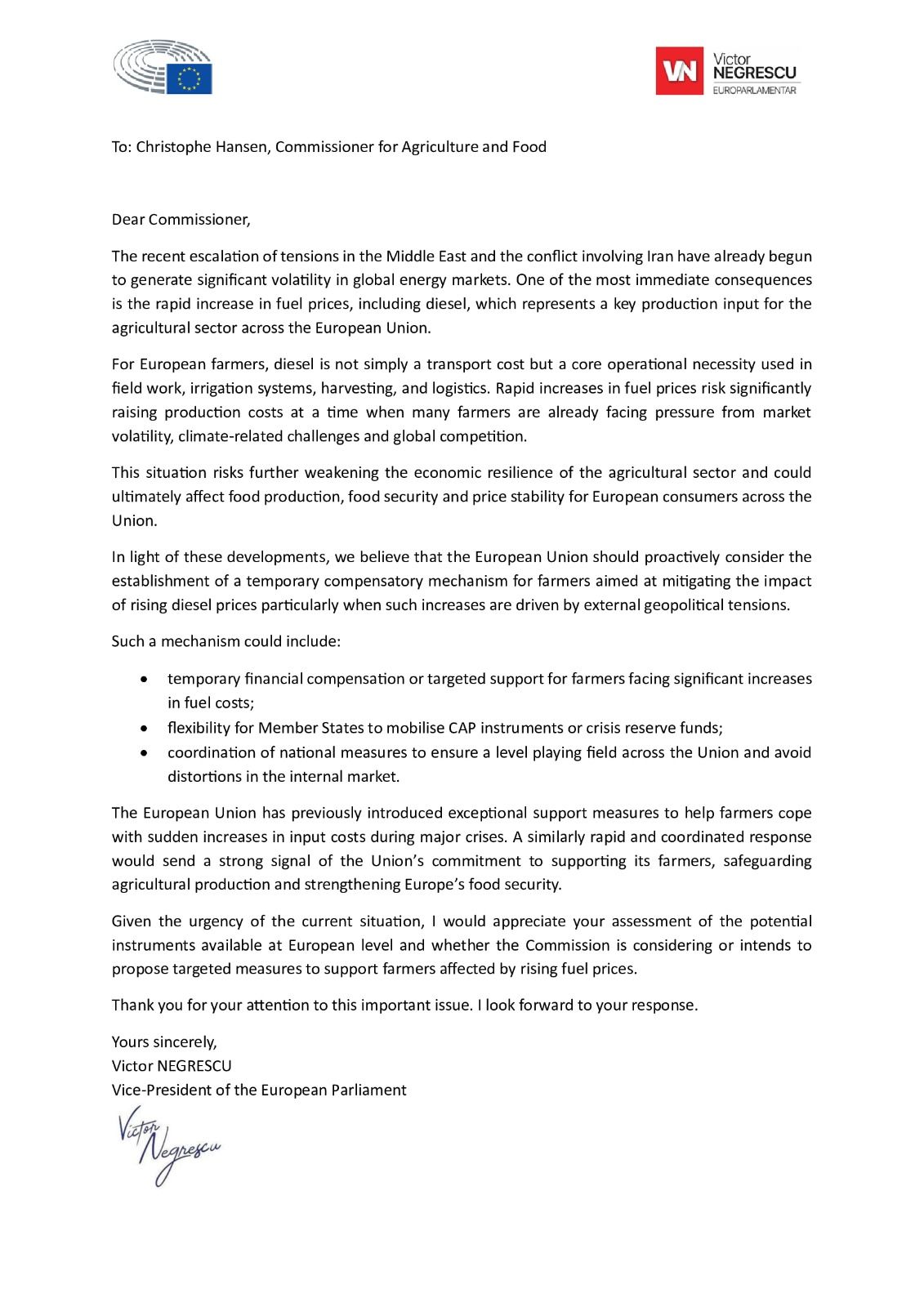 Conștient de gravitatea situației, europarlamentarul Victor Negrescu a transmis o scrisoare direct comisarului european pentru agricultură, Christophe Hansen. În acest demers, Negrescu solicită activarea de urgență a unui mecanism compensatoriu la nivel european. Obiectivul este clar: sprijinirea fermierilor afectați de majorarea prețurilor la carburanți, pentru a preveni colapsul financiar al multor exploatații agricole. „Uniunea Europeană trebuie să reacționeze rapid atunci când crizele geopolitice afectează direct producția agricolă și securitatea alimentară”, subliniază europarlamentarul, evidențiind necesitatea unei intervenții prompte și eficiente.