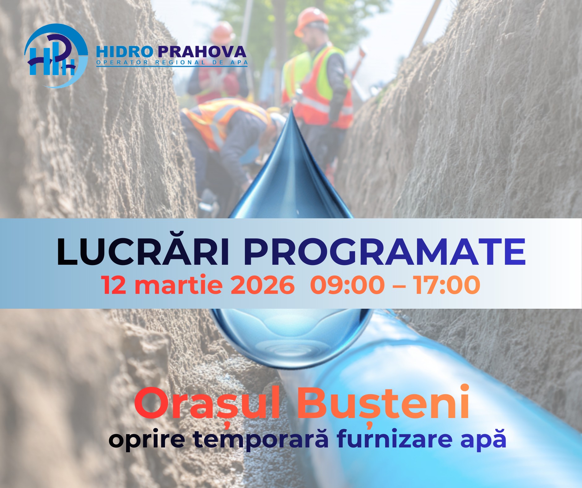 Locuitorii orașului Bușteni se confruntă joi, 12 martie 2026, cu o situație dificilă: întreruperi temporare în furnizarea apei potabile sau reducerea semnificativă a presiunii. Măsura, anunțată de HIDRO PRAHOVA S.A., vine ca urmare a unor lucrări esențiale de contorizare a consumului de apă pentru potabilizare, efectuate de către compania Hidro Jepi.