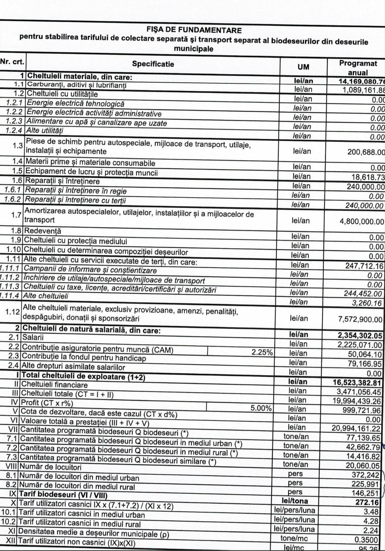 În mod normal, redevențele încasate ar putea fi o sursă importantă pentru bugetul local, capabilă să atenueze datoriile și să contribuie la scăderea tarifelor pentru populație. Dar, surpriză! O analiză a Fișei de Fundamentare a tarifului de colectare (Cap. 1.8) relevă că valoarea alocată pentru „Redevență” este de 0.00 lei/an. Zero! Aceasta înseamnă că operatorul nu are inclusă în tarif o cheltuială cu redevența, iar dacă ar exista o obligație contractuală de plată a acesteia către Primărie, ar fi un venit „curat”, dar neîncasat. Oare despre ce redevențe vorbim atunci, dacă ele nu apar nici măcar în calculul tarifului? Un mister mai mare decât Triunghiul Bermudelor!