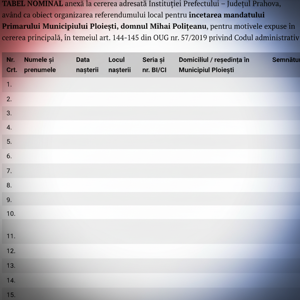 TABEL NOMINAL anexă la cererea adresată Instituţiei Prefectului – Județul Prahova, având ca obiect organizarea referendumului local pentru încetarea mandatului Primarului Municipiului Ploieşti, domnul Mihai Polițeanu, pentru motivele expuse în cererea principală, în temeiul art. 144-145 din OUG nr. 57/2019 privind Codul administrativ