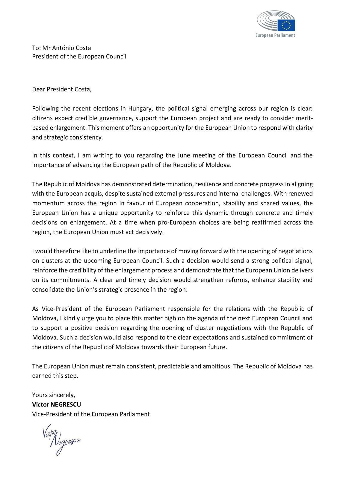 După o perioadă marcată de incertitudine și blocaje diplomatice, Republica Moldova primește o nouă șansă de a recupera timpul pierdut în procesul de integrare. Europarlamentarul PSD Victor Negrescu, în calitatea sa de vicepreședinte al Parlamentului European responsabil de relația cu Republica Moldova, a anunțat trimiterea unei scrisori oficiale către președintele Consiliului European, António Costa.