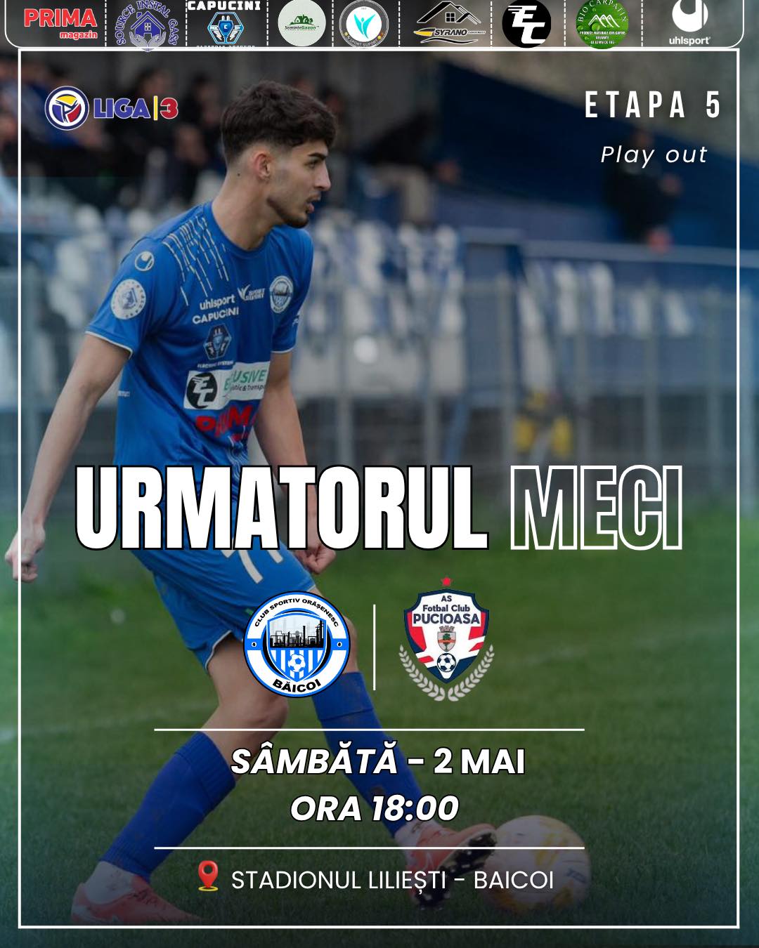 Sâmbătă, 2 mai, inima sportivă a orașului Băicoi va bate la unison pe Stadionul Liliești. Într-un duel care promite spectacol și dăruire, echipa locală, CSO Băicoi, primește vizita celor de la FC Pucioasa, într-o partidă crucială pentru ierarhia finală a acestui sezon.