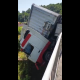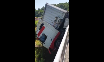 Accident spectaculos în judetul Argeș, acolo unde un TIR a sărit, practic, de pe un pod. Șoferul de TIR nu a adaptat viteza în curba ușoară...