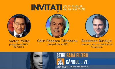 Președintele ALDE, Călin Popescu Tăriceanu, și președintele PRO România, Victor Ponta, se află printre invitații Emmei Zeicescu la ediția Gândul LIVE de joi, 13 august, de...