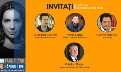 Gândul Live. Cosmin Andreica, lider sindicat Europol, Nansi Lungu, analist comportamental și Cristian Barbu, vicepreședinte ALDE București, se numără printre invitații Emmei Zeicescu, luni, 13 iulie,...