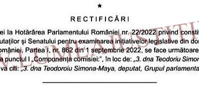 Parlamentul n-a fost in stare sa scrie corect numele deputatei PSD Simona-Maya Teodoroiu in numarul din Monitorul Oficial in care a aparut componenta noii comisii parlamentare...