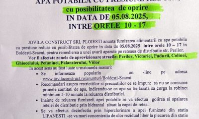 SC JOVILA CONSTRUCT SRL anunță că marți, 5 august 2025, alimentarea cu apă potabilă va fi afectată în anumite zone din Boldești-Scăeni. În intervalul orar 10:00...