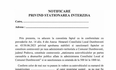 Primăria Dumbrăvești informează cetățenii cu privire la intrarea în vigoare a Hotărârii nr. 43 din 30 iunie 2025, care stabilește și sancționează faptele ce constituie contravenții...