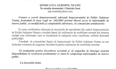 Șeful IPJ Neamț, comisar șef de poliție Osoianu Mihai Iulian, refuză să aplice prevederile acordului privind contracte de asigurare facultativă pentru mijloacele de mobilitate navală și terestră din dotarea IPJ Neamț.