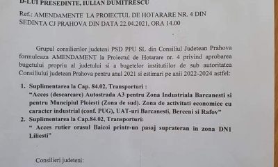 În cadrul ședinței ordinare a Consiliului Județean Prahova, desfașurată ieri, Grupul consilierilor județeni PSD – PPU SL a depus două amendamente la Proiectul deHotărâre nr. 4 privind aprobarea bugetului propriu al județului și a bugetelor instituțiilor de sub autoritatea Consiliului Județean Prahova pentru anul 2021