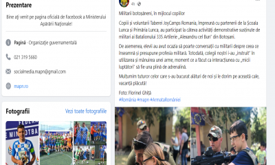 Ministerul Apărării a publicat pe pagina sa de FB mai multe imagini cu soldați români echipați de luptă învățând copiii cum să tragă cu arma