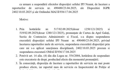 Ioan Cănărău, lider sindical din Poliția Neamț, a fost destituit din funcție la doar câteva minute după ce fusese reîncadrat în urma unei decizii judecătorești, declanșând...
