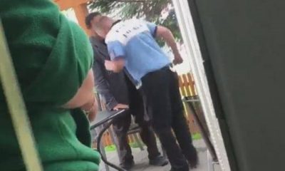 Imagini șocante surprinse, zilele trecute, la o terasă din localitatea timișeană Gătaia. Un om al străzii este lovit cu putere cu capul de un polițist local....