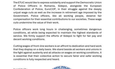 Confederația Europeană a Sindicatelor (ETUC) își exprimă solidaritatea și susținerea față de Sindicatul Democratic al Polițiștilor – Sidepol, alături de Confederația Europeană a Poliției – EuroCOP....