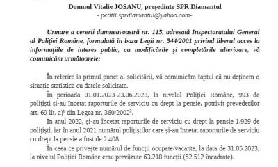 Situatia pensionărilor in perioada ianuarie -iunie 2023, la nivelul Politiei Romane! Din raspunsul adresat sindicatului Diamantul reies cateva aspecte de interes operativ: Sunt 10.706 functii...